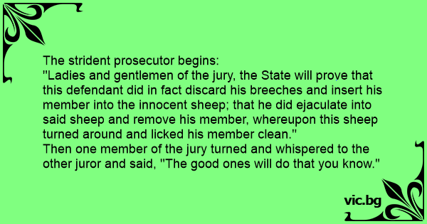 ''Ladies and gentlemen of the jury, the State will prove that this defendant did in fact discard his breeches and insert his member into the innocent sheep; that he did еjасulате into said sheep and remove his member, whereupon this sheep turned around and licked his member clean.''