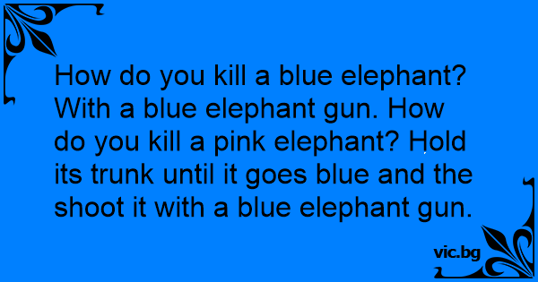 How do you кill a blue elephant?<br />With a blue elephant gun. How do you кill a pink elephant? Hold its trunk until it goes blue and the shoot it with a blue elephant gun.
