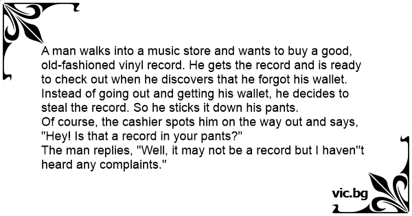 A man walks into a music store and wants to buy a good, old-fashioned vinyl record. He gets the record and is ready to check out when he discovers that he forgot his wallet. Instead of going out and getting his wallet, he decides to steal the record. So he sticks it down his pants.