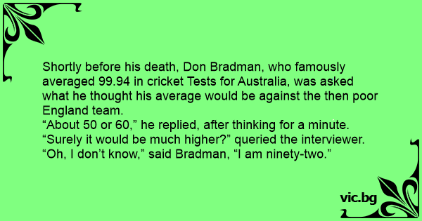 Shortly before his death, Don Bradman, who famously averaged 99.94 in cricket Tests for Australia, was asked what he thought his average would be against the then poor England team.