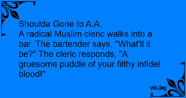 A radical Muslim cleric walks into a bar. The bartender says, "What'll it be?" The cleric responds, "A gruesome puddle of your filthy infidel blood!"