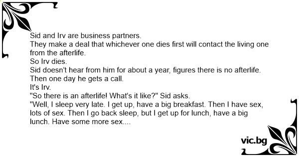 "Oh no," says Irv. "I'm not in heaven. I'm a bear in Yellowstone Park."