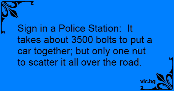 Sign in a Police Station: It takes about 3500 bolts to put a car together; but only one nut to scatter it all over the road.