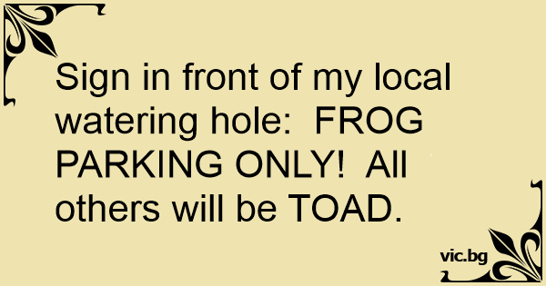 Sign in front of my local watering hole: FROG PARKING ONLY! All others will be TOAD.
