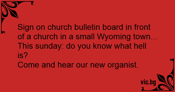 Sign on church bulletin board in front of a church in a small Wyoming town...<br />This sunday: do you know what hеll is?<br />Come and hear our new organist.