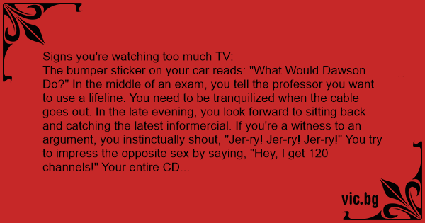 Signs you're watching too much TV: The bumper sticker on your car reads: "What Would Dawson Do?" In the middle of an exam, you tell the professor you want to use a lifeline. You need to be tranquilized when the cable goes out. In the late evening, you look forward to sitting back and catching the latest informercial. If you're a witness to an argument, you instinctually shout, "Jer-ry! Jer-ry! Jer-ry!" You try to impress the opposite sеx by saying, "Hey, I get 120 channels!" Your entire CD collection consists of "Greatest Hits" albums by the decade. You have a gold-plated "clicker." Your intellectual discussions all stem from The Discovery Channel. After 15 minutes of work, you need a two-minute break.