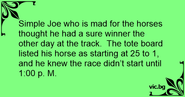 Simple Joe who is mad for the horses thought he had a sure winner the other day at the track. The tote board listed his horse as starting at 25 to 1, and he knew the race didn’t start until 1:00 p. M.