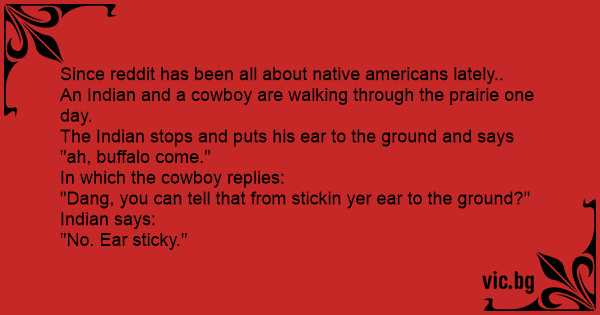 The Indian stops and puts his ear to the ground and says "ah, buffalo come."