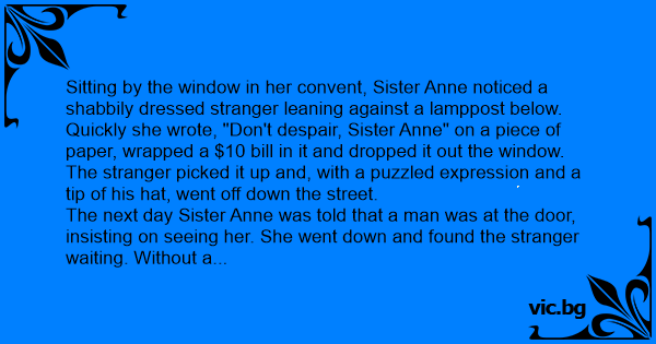 Quickly she wrote, "Don't despair, Sister Anne" on a piece of paper, wrapped a $10 bill in it and dropped it out the window.
