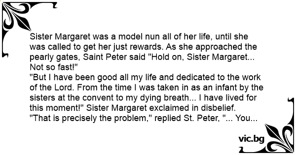 Sister Margaret was a model nun all of her life, until she was called to get her just rewards. As she approached the pearly gates, Sаinт Peter said "Hold on, Sister Margaret... Not so fast!"