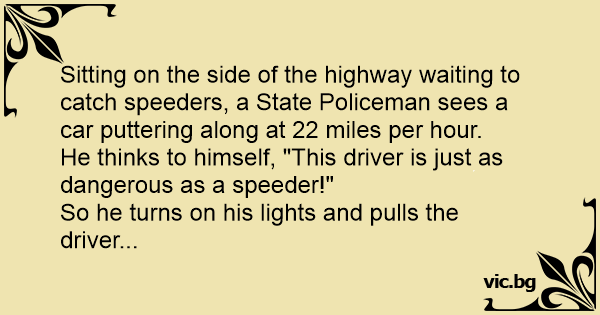 Sitting on the side of the highway waiting to catch speeders, a State Policeman sees a car puttering along at 22 miles per hour.
