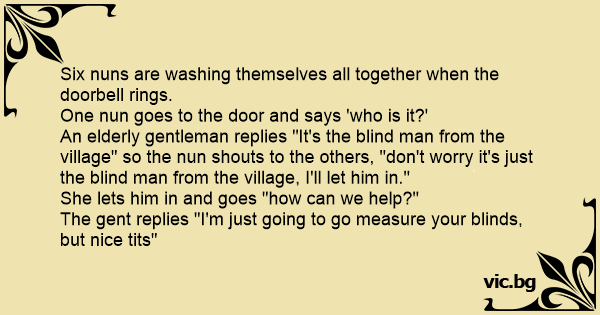 An elderly gentleman replies "It's the blind man from the village" so the nun shouts to the others, "don't worry it's just the blind man from the village, I'll let him in."