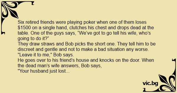 Six retired friends were playing poker when one of them loses $1500 on a single hand, clutches his chest and drops dead at the table. One of the guys says, “We’ve got to go tell his wife, who’s going to do it?”