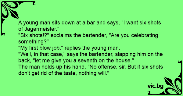 A man walks into a bar and says loudly, "Bartender, six shots!" The bartender looks at him and says, "Wow six shots, whats the occasion?" The man replies , "First blоwjob!"