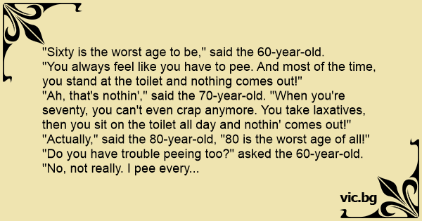 "Ah, that's nothin'," said the 70-year-old. "When you're seventy, you can't even сrар anymore. You take laxatives, then you sit on the toilet all day and nothin' comes out!"
