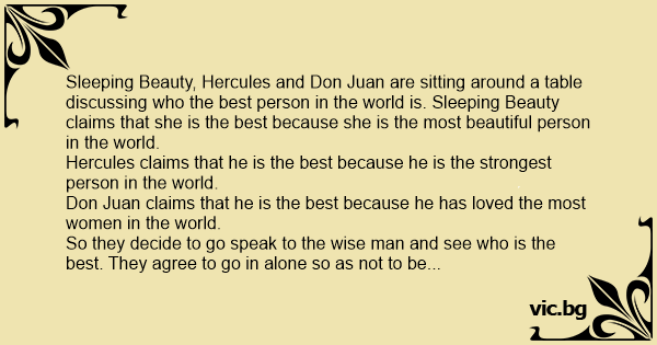 Sleeping Beauty, Hercules and Don Juan are sitting around a table discussing who the best person in the world is. Sleeping Beauty claims that she is the best because she is the most beautiful person in the world.