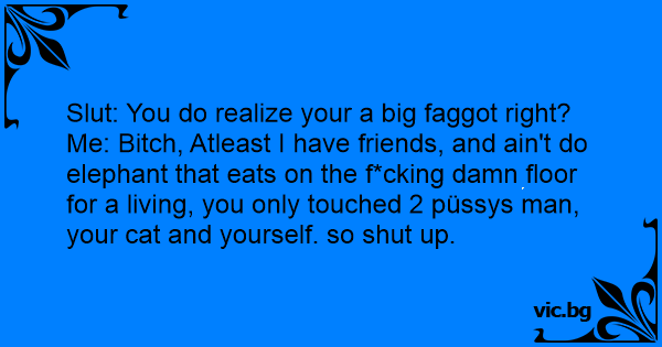Me: Вiтсh, Atleast I have friends, and ain't do elephant that eats on the f*cking dамn floor for a living, you only touched 2 püssys man, your cat and yourself. so shut up.