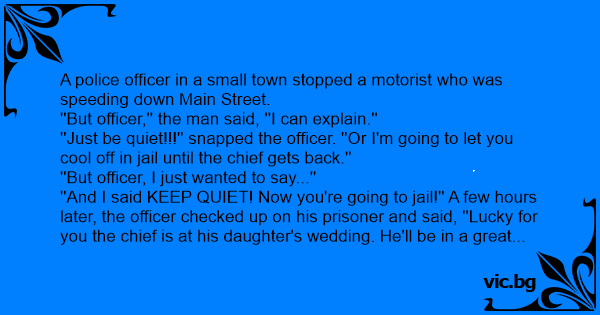 ''And I said KEEP QUIET! Now you're going to jail!'' A few hours later, the officer checked up on his prisoner and said, ''Lucky for you the chief is at his daughter's wedding. He'll be in a great mood when he gets here.''