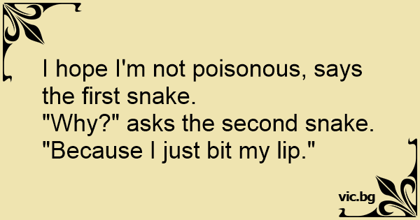 Två ormar möts bakom en sten: - Vet du om vi är giftiga? - Varför undrar du det? - Jo, för jag råkade bita mig i underläppen...