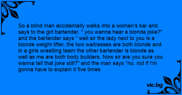 So a blind man accidentally walks into a women's bar and says to the girl bartender, " you wanna hear a blonde joke?" and the bartender says " well sir the lady next to you is a blonde weight lifter, the two waitresses are both blonde and in a girls wrestling team the other bartender is blonde as well as me are both body builders. Now sir are you sure you wanna tell that joke still?" and the man says "no. not if I'm gonna have to explain it five times