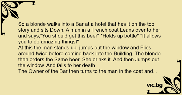 At this the man stands up, jumps out the window and Flies around twice before coming back into the Building. The blonde then orders the Same вееr. She drinks it. And then Jumps out the window. And falls to her death.