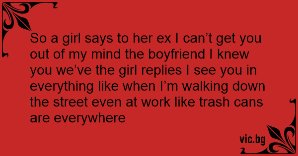 So a girl says to her ex I can’t get you out of my mind the boyfriend I knew you we’ve the girl replies I see you in everything like when I’m walking down the street even at work like trash cans are everywhere