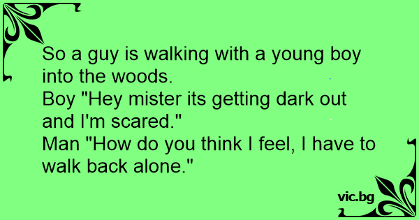 En pedofil lockar med lilla Per ut i skogen. Lille Per: “Uhh det är så mysigt här ute i skogen…” Pedofilen: “Tänk på mig! Jag ska gå hem helt själv…”