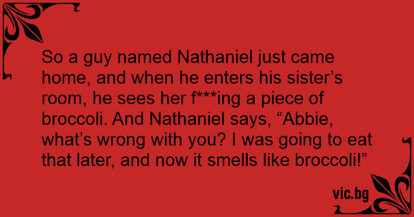 So a guy named Nathaniel just came home, and when he enters his sister’s room, he sees her f***ing a piece of broccoli. And Nathaniel says, “Abbie, what’s wrong with you? I was going to eat that later, and now it smells like broccoli!”