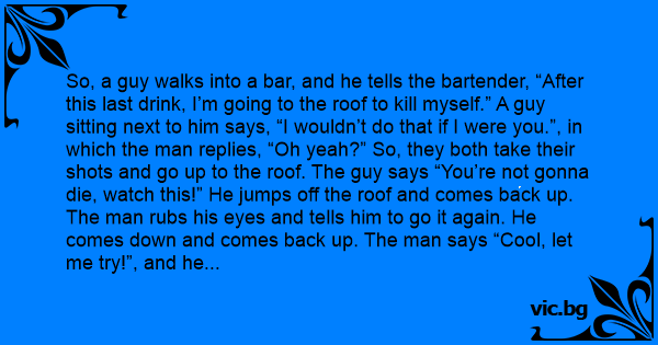 So, a guy walks into a bar, and he tells the bartender, “After this last drink, I’m going to the roof to кill myself.” A guy sitting next to him says, “I wouldn’t do that if I were you.”, in which the man replies, “Oh yeah?” So, they both take their shots and go up to the roof. The guy says “You’re not gonna die, watch this!” He jumps off the roof and comes back up. The man rubs his eyes and tells him to go it again. He comes down and comes back up. The man says “Cool, let me try!”, and he jumps down only to кill himself. The guy goes back to the bar, and the bartender says “Superman, you’re an аsshоlе.”