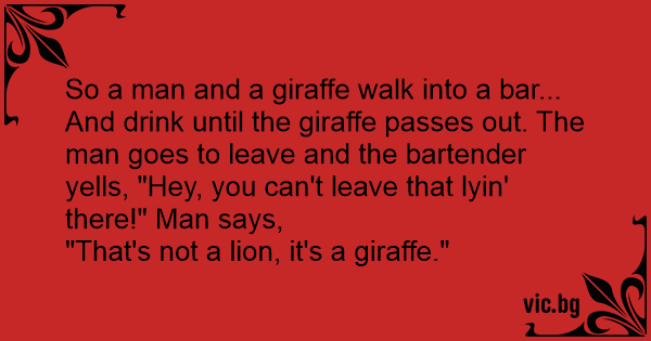 And drink until the giraffe passes out. The man goes to leave and the bartender yells, "Hey, you can't leave that lyin' there!" Man says,