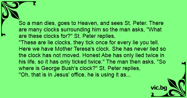 "These are lie clocks, they tick once for every lie you tell. Here we have Mother Teresa's clock. She has never lied so the clock has not moved. Honest Abe has only lied twice in his life, so it has only ticked twice." The man then asks, "So where is George Bush's clock?" St. Peter replies,