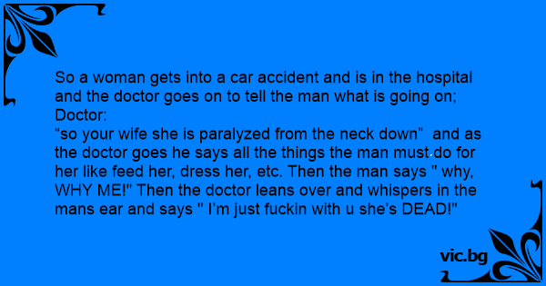 “so your wife she is paralyzed from the neck down” and as the doctor goes he says all the things the man must do for her like feed her, dress her, etc. Then the man says " why, WHY ME!" Then the doctor leans over and whispers in the mans ear and says " I’m just fuскin with u she’s DEAD!"