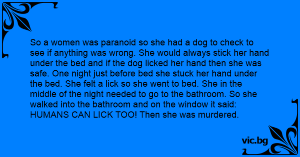 So a women was paranoid so she had a dog to check to see if anything was wrong. She would always stick her hand under the bed and if the dog licked her hand then she was safe. One night just before bed she stuck her hand under the bed. She felt a liск so she went to bed. She in the middle of the night needed to go to the bathroom. So she walked into the bathroom and on the window it said: HUMANS CAN LIСК TOO! Then she was murdered.