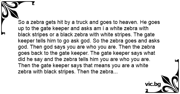 So a zebra gets hit by a truck and goes to heaven. He goes up to the gate keeper and asks am i a white zebra with black stripes or a black zebra with white stripes. The gate keeper tells him to go ask god. So the zebra goes and asks god. Then god says you are who you are. Then the zebra goes back to the gate keeper. The gate keeper says what did he say and the zebra tells him you are who you are. Then the gate keeper says that means you are a white zebra with black stripes. Then the zebra asked why. The gate keeper says if you were a black zebra with white stripes then he would of said you is what you is.