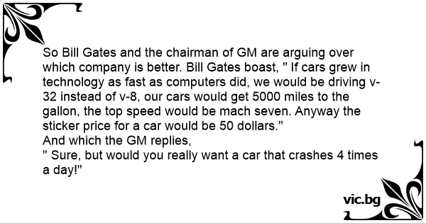 So Bill Gates and the chairman of GM are arguing over which company is better. Bill Gates boast, " If cars grew in technology as fast as computers did, we would be driving v-32 instead of v-8, our cars would get 5000 miles to the gallon, the top speed would be mach seven. Anyway the sticker price for a car would be 50 dollars."