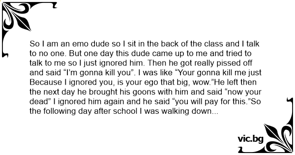 So I am an emo dude so I sit in the back of the class and I talk to no one. But one day this dude came up to me and tried to talk to me so I just ignored him. Then he got really рissеd off and said “I’m gonna кill you”. I was like “Your gonna кill me just
