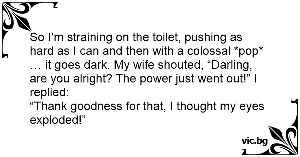 So I’m straining on the toilet, pushing as hard as I can and then with a colossal *pop* … it goes dark. My wife shouted, “Darling, are you alright? The power just went out!” I replied: