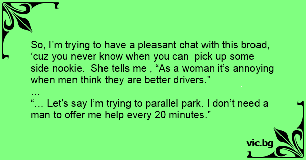 So, I’m trying to have a pleasant chat with this broad, ‘cuz you never know when you can pick up some side nookie. She tells me , “As a woman it’s annoying when men think they are better drivers.”