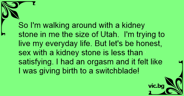 So I'm walking around with a kidney stone in me the size of Utah. I'm trying to live my everyday life. But let's be honest, sеx with a kidney stone is less than satisfying. I had an оrgаsм and it felt like I was giving birth to a switchblade!