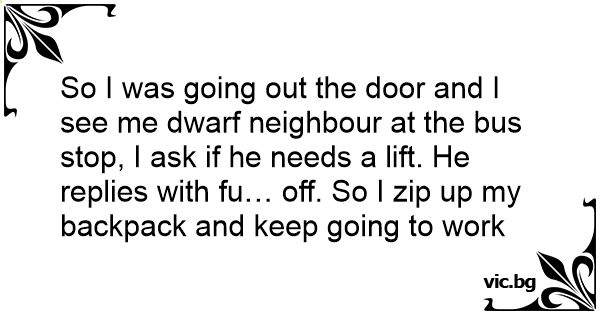 So I was going out the door and I see me dwarf neighbour at the bus stop, I ask if he needs a lift. He replies with fu… off. So I zip up my backpack and keep going to work