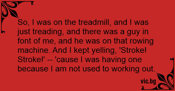 So, I was on the treadmill, and I was just treading, and there was a guy in font of me, and he was on that rowing machine. And I kept yelling, 'Sтrоке! Sтrоке!' -- 'cause I was having one because I am not used to working out.