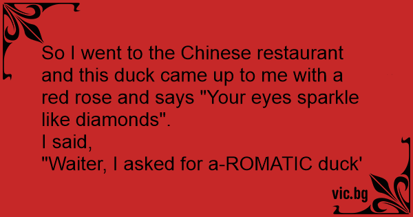 So I went to the Chinese restaurant and this duck came up to me with a red rose and says "Your eyes sparkle like diamonds".