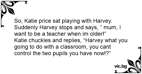 Katie chuckles and replies, “Harvey what you going to do with a classroom, you cant control the two pupils you have now!?”