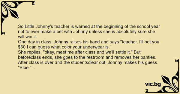 One day in class, Johnny raises his hand and says "teacher, I'll bet you $50 I can guess what color your underwear is."