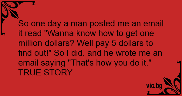So one day a man posted me an email it read "Wanna know how to get one million dollars? Well pay 5 dollars to find out!" So I did, and he wrote me an email saying "That's how you do it." TRUE STORY