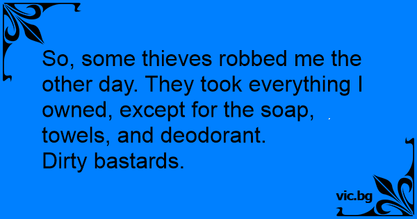So, some thieves robbed me the other day. They took everything I owned, except for the soap, towels, and deodorant.