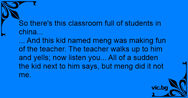 ... And this kid named meng was making fun of the teacher. The teacher walks up to him and yells; now listen you... All of a sudden the kid next to him says, but meng did it not me.