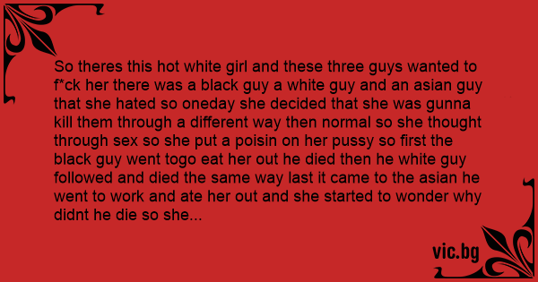 So theres this hot white girl and these three guys wanted to fuск her there was a black guy a white guy and an asian guy that she hated so oneday she decided that she was gunna кill them through a different way then normal so she thought through sеx so she put a poisin on her рussy so first the black guy went togo eat her out he died then he white guy followed and died the same way last it came to the asian he went to work and ate her out and she started to wonder why didnt he die so she asked andhe said "i no sтuрid i no dumb i put соndом on my tounge