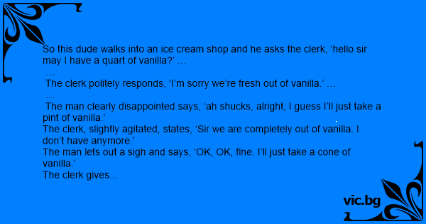 So this dude walks into an ice cream shop and he asks the clerk, ‘hello sir may I have a quart of vanilla?’ …