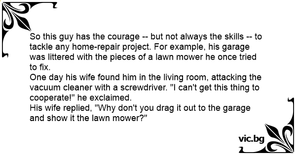 His wife replied, "Why don't you drag it out to the garage and show it the lawn mower?"